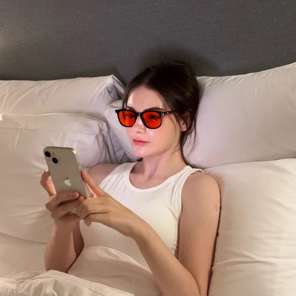 Our precision lenses gently filter blue light to help ease visual strain, reduce glare, and promote calmer evenings — without the orange tint or bulky look of traditional blockers.